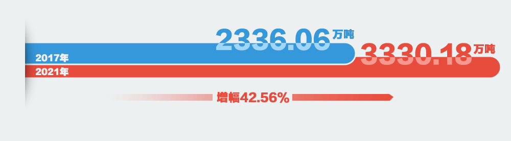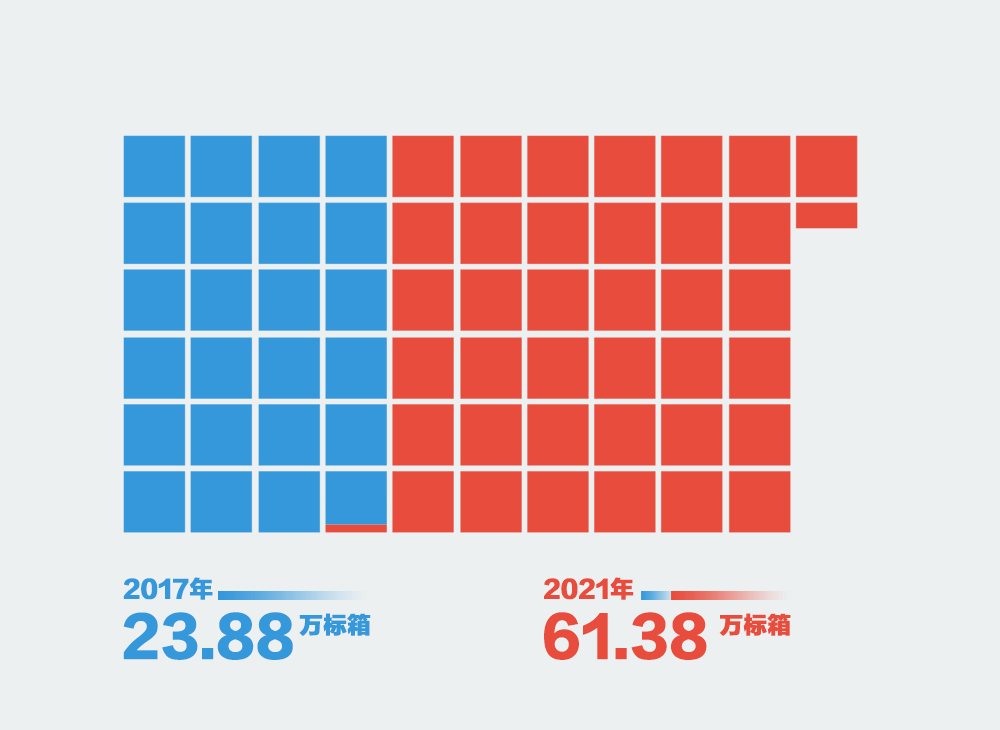 据统计,2017~2021年,北海码头年货物吞吐量从2336.06万吨增长至3330.18万吨,5年间增幅达42.56%。其中,集装箱吞吐量从23.88万标箱增长至61.38万标箱,5年间增幅达157.04%。