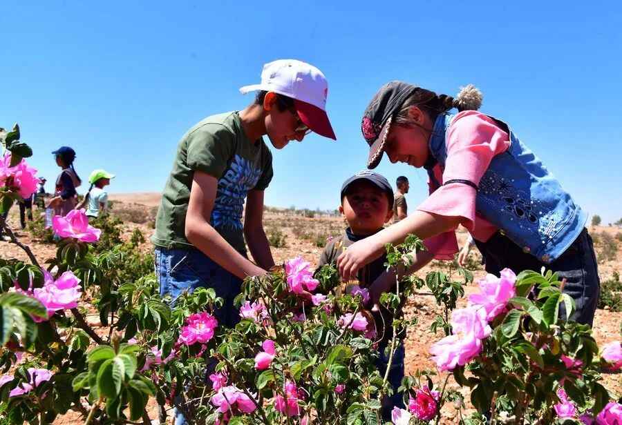 图片2022年5月19日,人们在叙利亚大马士革以北采摘大马士革玫瑰。新华社发(阿马尔·萨法尔贾拉尼摄)