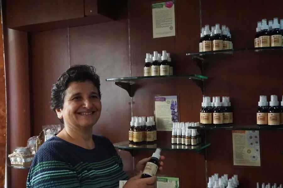 图片10月23日,在叙利亚首都大马士革,鲁拉·阿迪卜展示自家企业生产的玫瑰纯露。新华社记者汪健摄