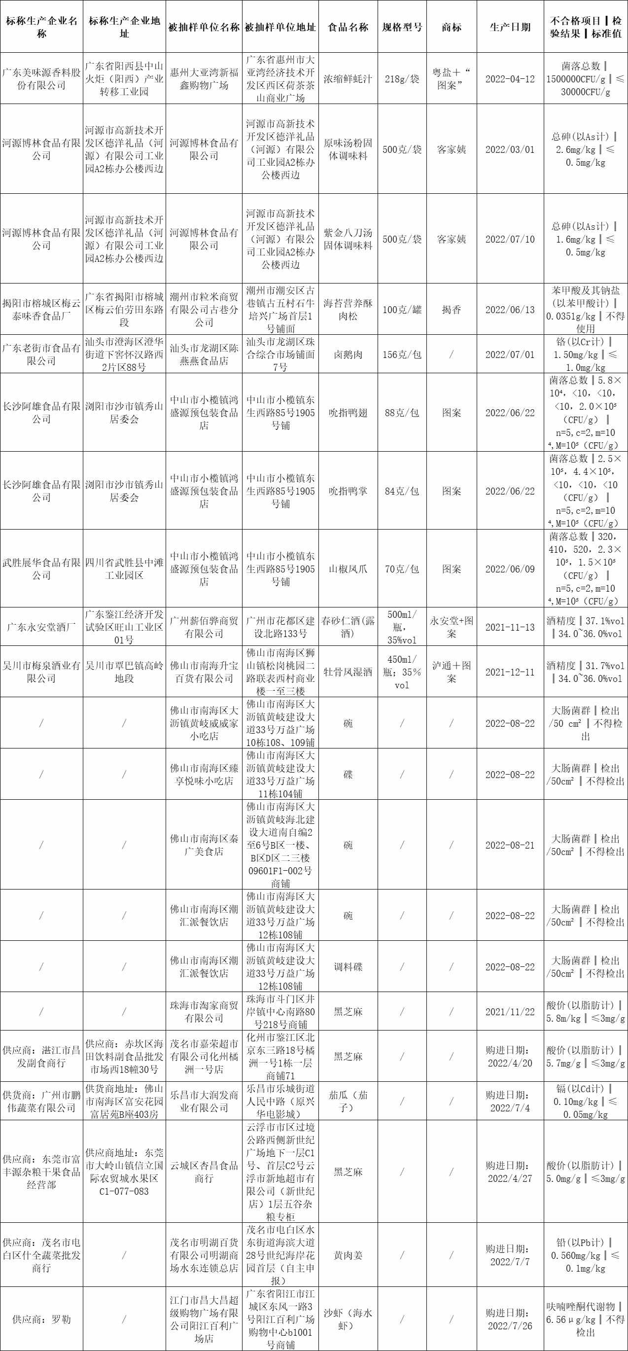 此外,标称河源博林食品有限公司生产的原味汤粉固体调味料和紫金八刀汤固体调味料,总砷(以As计)不符合食品安全国家标准规定;珠海市淘家商贸有限公司销售的黑芝麻、茂名市嘉荣超市有限公司化州橘洲一号店销售的黑芝麻、云浮市云城区杏昌食品商行销售的黑芝麻,酸价(以脂肪计)不符合食品安全国家标准规定。