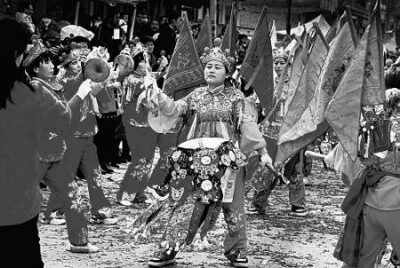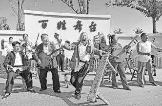 陕西省渭南市阿寿村村民在村头进行花苫鼓表演。新华社发