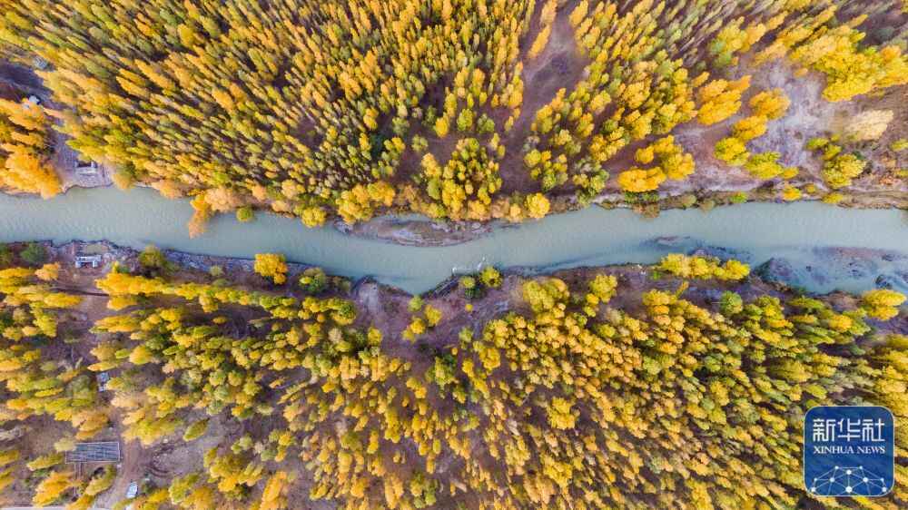 ↑新疆博乐博尔塔拉河国家湿地公园秋景(2022年10月20日摄,无人机照片)。新华社发(于苏甫·艾尼 摄)