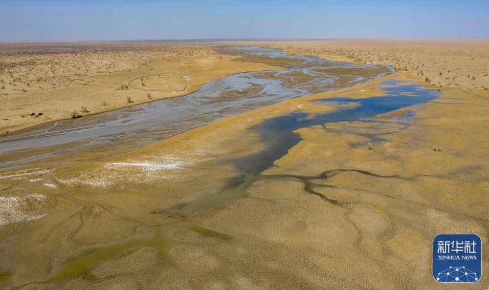 ↑这是在塔克拉玛干沙漠腹地拍摄的新疆于田克里雅河国家湿地公园一角(2019年3月19日摄,无人机照片)。新华社记者 胡虎虎 摄