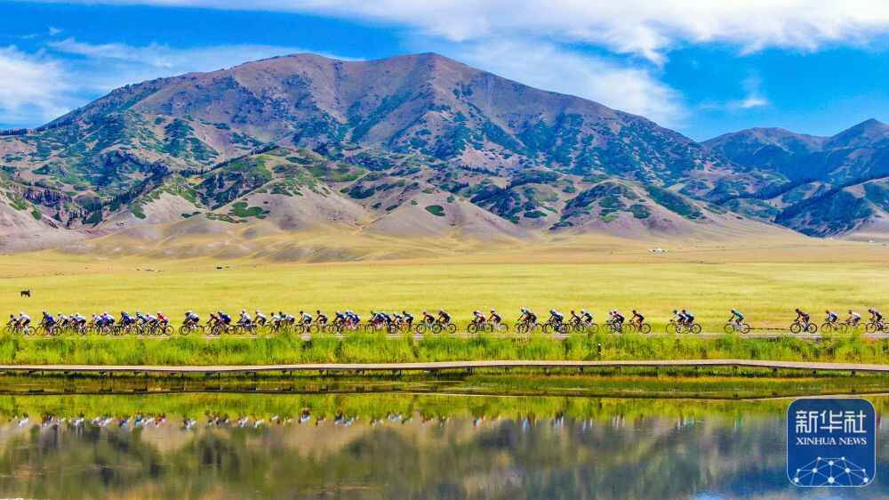 ↑自行车赛选手在新疆赛里木湖国家湿地公园骑行(2022年7月26日摄,无人机照片)。新华社发(于苏甫·艾尼 摄)