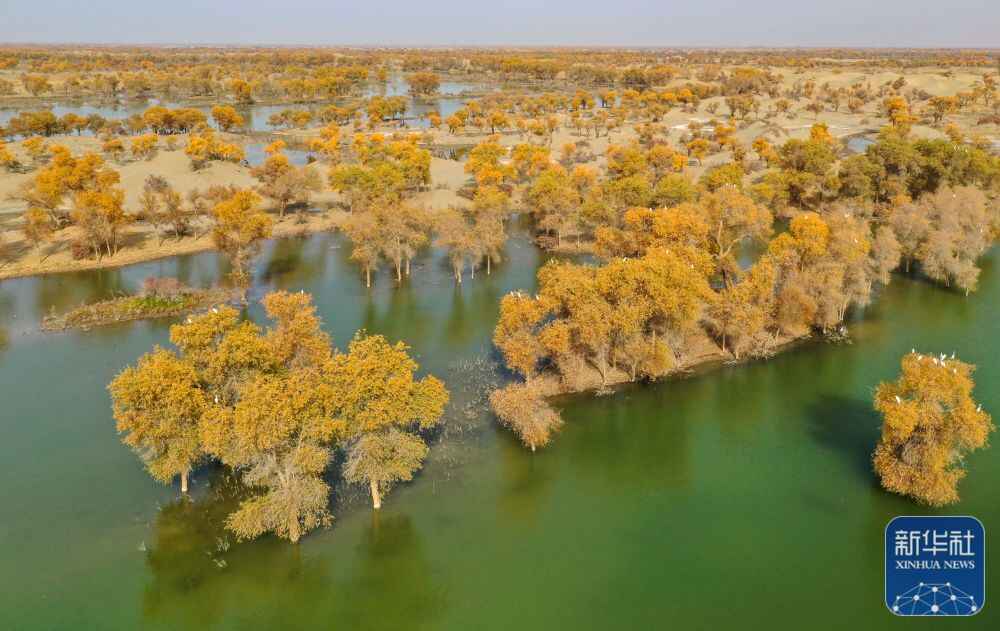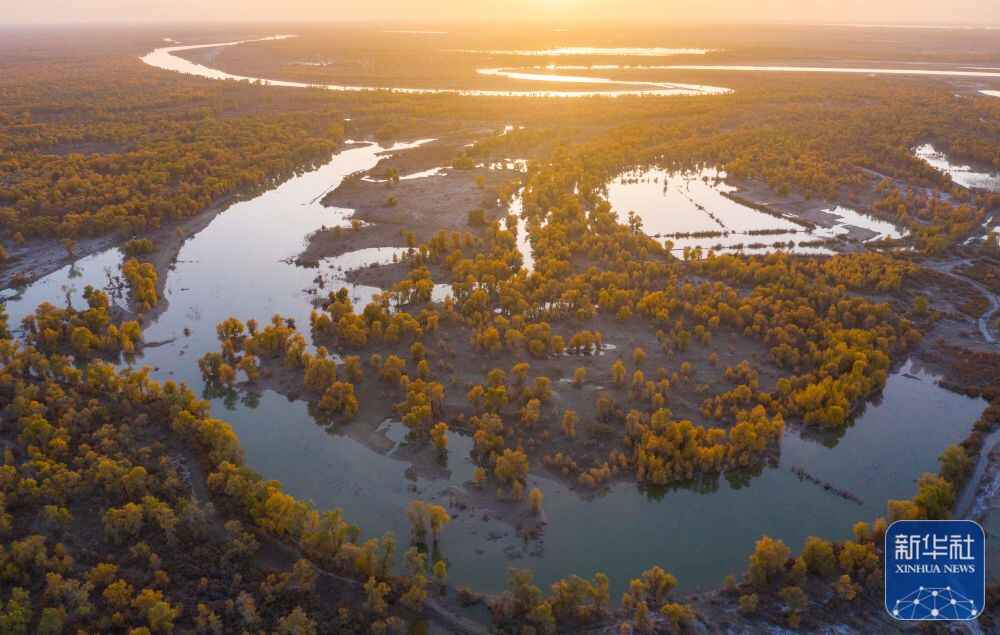 ↑新疆尉犁县罗布淖尔国家湿地公园秋景(2022年10月31日摄,无人机照片)。新华社发(汪志鹏 摄)