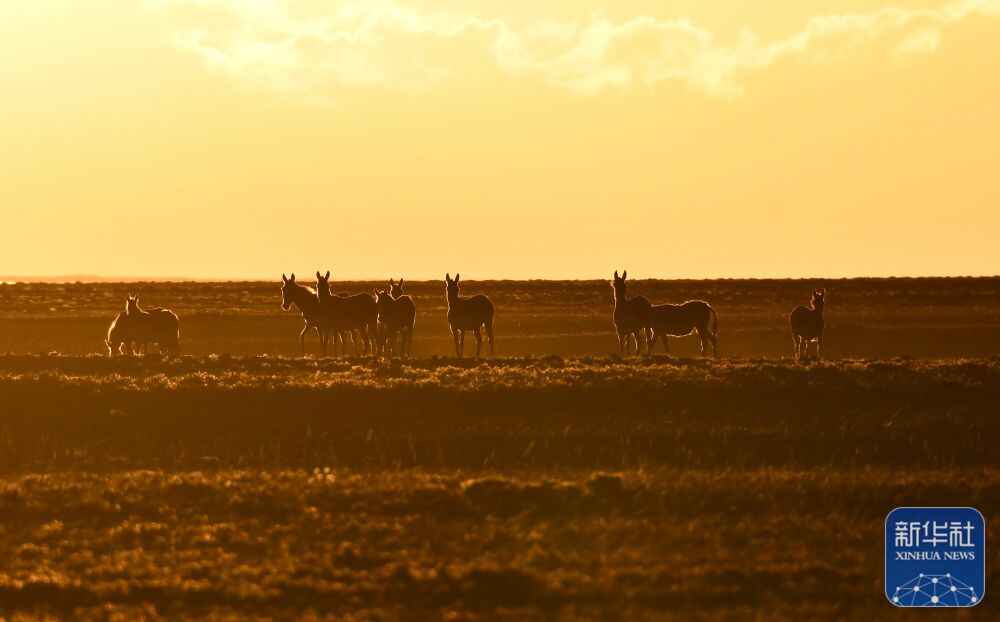 ↑藏野驴在新疆阿尔金山国家级自然保护区内的依协克帕提湿地觅食(2022年8月3日摄)。新华社发(徐俊泉 摄)