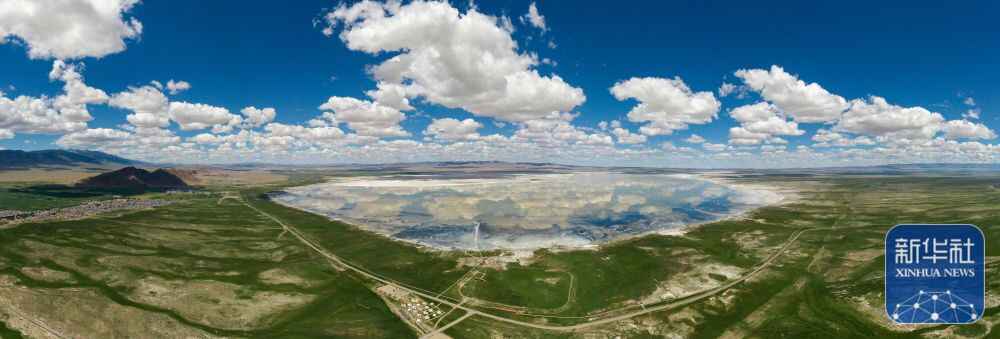 ↑新疆巴里坤湖及湖畔湿地夏季风光(2021年7月1日摄,无人机全景照片)。新华社记者 胡虎虎 摄