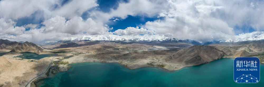↑新疆帕米尔高原上公格尔九别峰和慕士塔格峰山脚下的湖泊湿地景观(2020年6月16日摄,无人机全景照片)。新华社记者 胡虎虎 摄