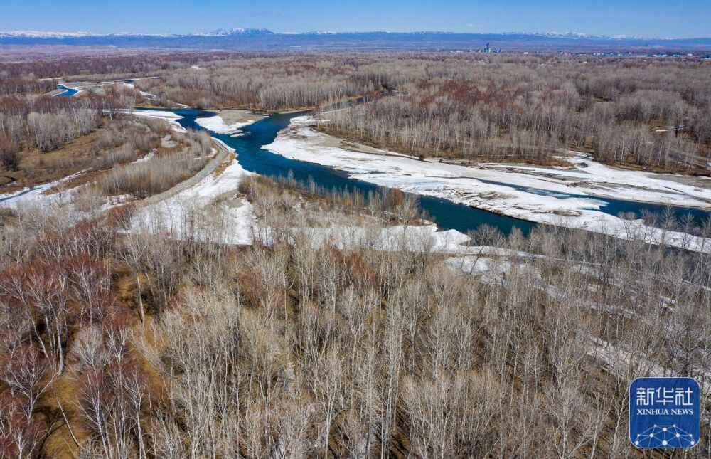 ↑新疆哈巴河及其支流交汇而成的宽浅河滩湿地上遍布白桦林(2021年4月8日摄,无人机照片)。新华社记者 胡虎虎 摄