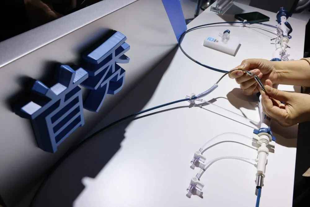 11月5日,在第五届进博会医疗器械及医药保健展区,工作人员在演示一款无导线心脏起搏器。新华社记者 金立旺 摄