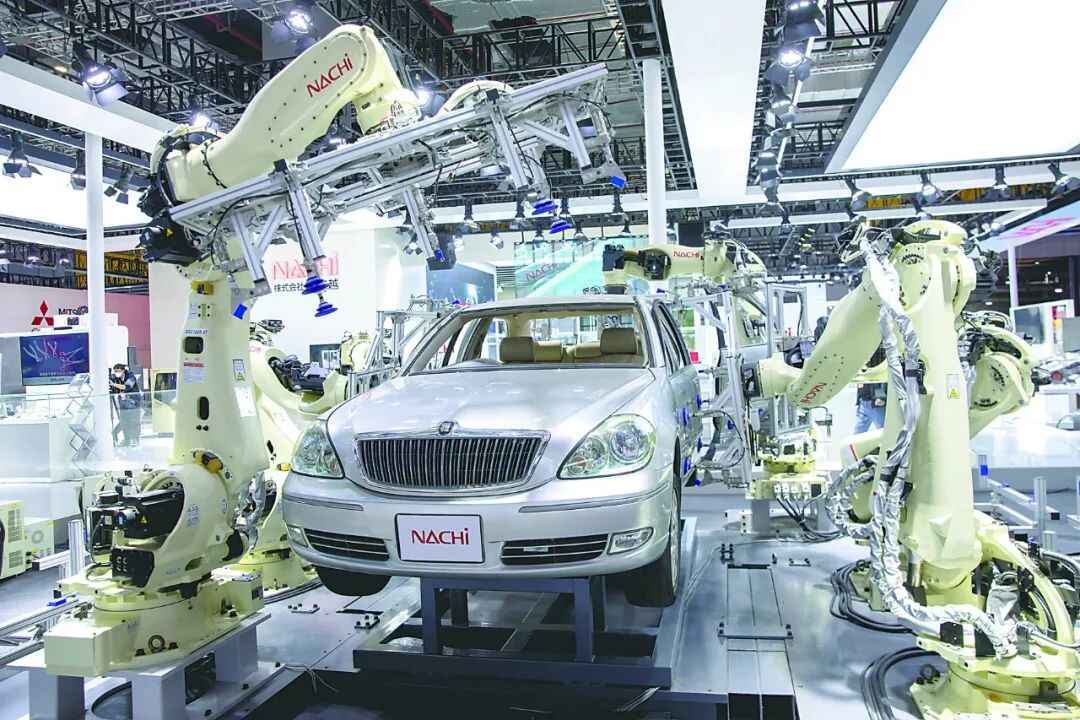 11月5日至10日,第五届中国国际进口博览会在国家会展中心(上海)举行。图为11月5日,在进博会技术装备展区,日本公司NACHI带来的高速、多用途SRA系列机器人正在组装汽车。(图片来源:视觉中国)