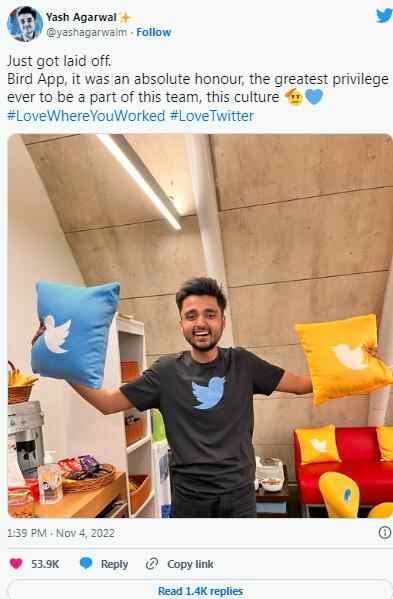 “这张照片在网上传开了”,印度《论坛报》5日说,照片中的主人公是一名曾为推特工作的25岁印度年轻人,他叫亚什·阿加瓦尔。报道说,亚什分享自己的微笑和配文“刚刚被裁员。推特,曾经作为其中一员,是绝对的荣耀,是最大的荣誉……”他还在推文中配了两个标签,#爱自己工作的地方#爱推特。他的积极乐观让很多人发帖送给他激励的话语。