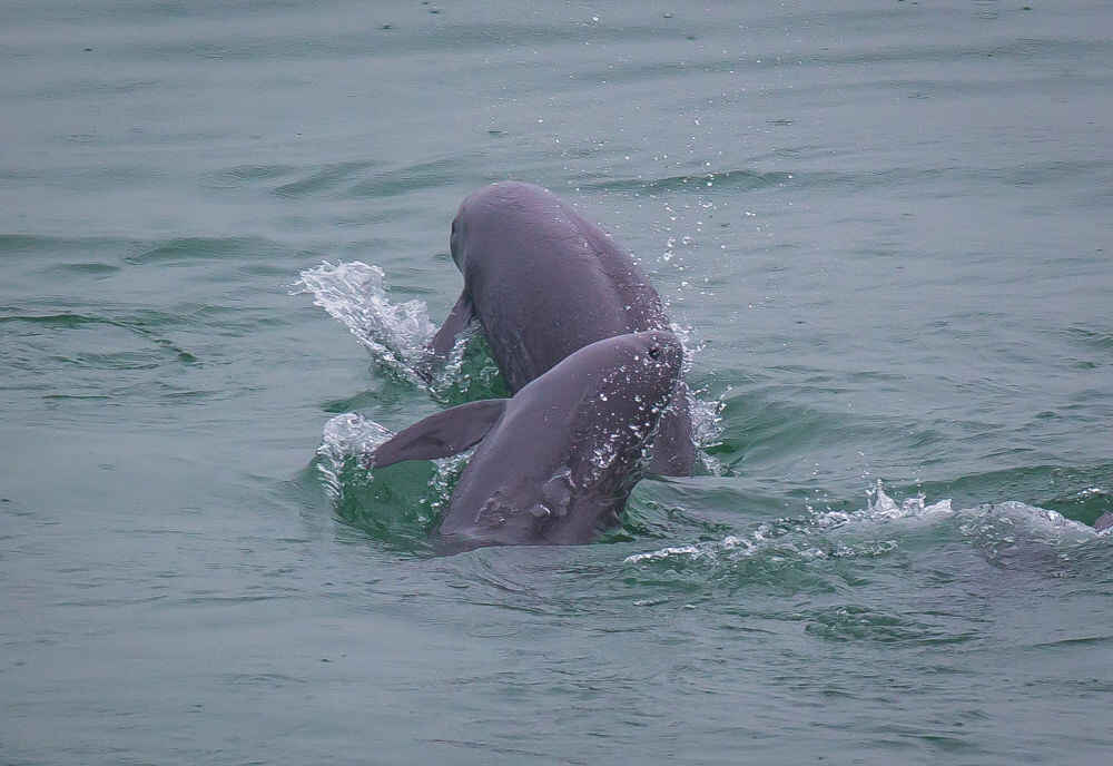 在湖北省宜昌市江边,长江江豚在水中嬉戏(2021年5月10日摄)。新华社记者 肖艺九 摄