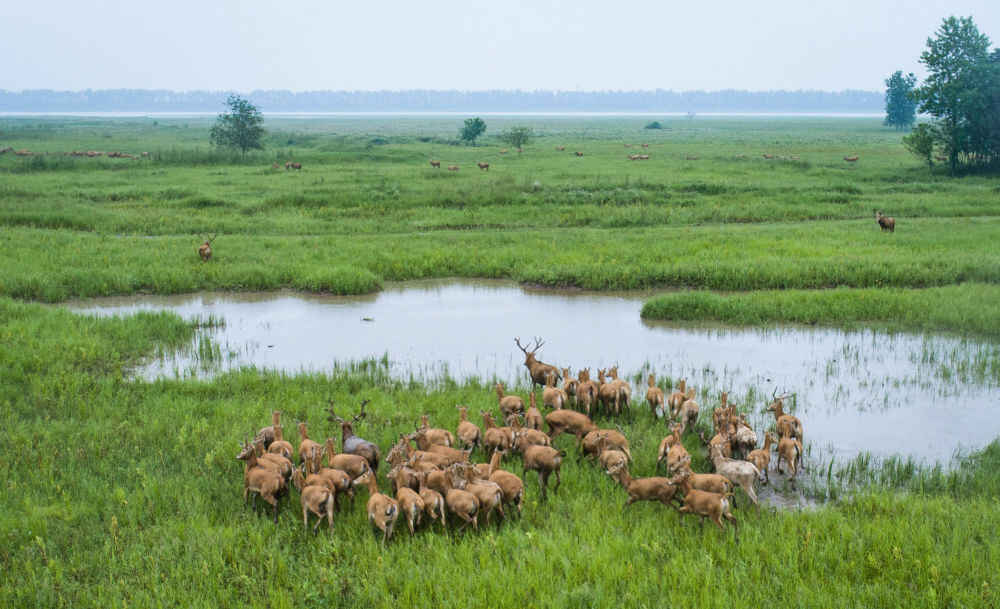 一群麋鹿在湖北石首麋鹿国家级自然保护区内活动(2021年5月17日摄,无人机照片)。新华社记者 肖艺九 摄