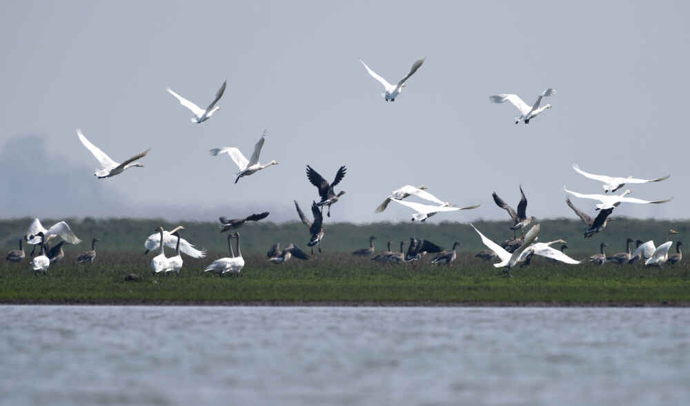 一群小天鹅和豆雁在洞庭湖的一处湿地生境修复工程实验区内飞翔(2018年2月26日摄)。新华社记者 李尕 摄