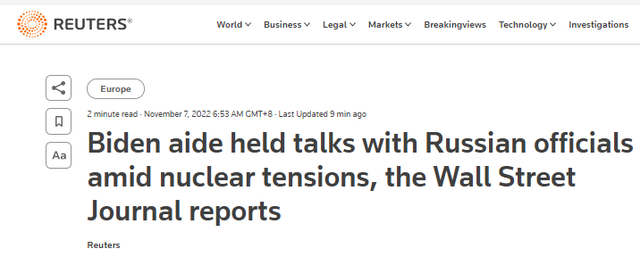 路透社介绍,近几个月来,美国和俄罗斯之间的高层接触很少公开,因为华盛顿方面坚称任何关于结束俄乌冲突的会谈都应该在莫斯科和基辅之间进行。报道还提到,沙利文于上周五(11月4日)访问了基辅。
