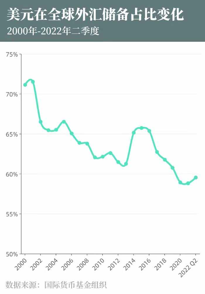 事实上,近年来美元国际地位已明显下滑。IMF数据显示,今年第二季度,美元在全球官方外汇储备资产中占比约为59.5%,而2001年美元占比曾一度高达72.7%。