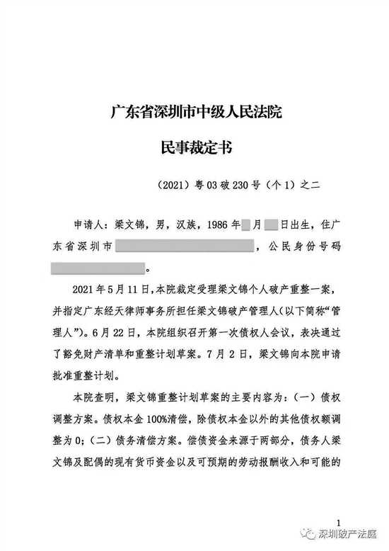 一年之后,路过深圳市中级人民法院时,梁文锦仍会回想起自己申请个人破产的那天。2021年3月10日,深圳市民梁文锦向深圳市中级人民法院申请个人破产。同年7月19日,法院向他送达了民事裁定书,批准了他的个人破产重整计划草案。这是我国境内裁定生效的首宗个人破产案。
