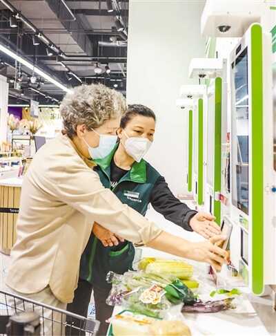北京七鲜超市姚家园店,顾客使用自助结账系统进行支付。 本报记者 蒋雨师摄
