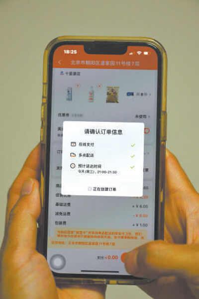 在互联网技术支持下,传统超市纷纷进行线上线下一体化转型。消费者在家用手机应用程序下单,超市工作人员第一时间就能收到订单提醒并进行商品分拣打包。配送员在超市取货后送货上门,实现消费者足不出户,商品配送到家。 图为消费者通过“多点”手机应用程序购物并预约3小时后送货上门。