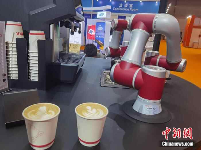 节卡机器人展台,节卡智能咖啡机在熟练地制作咖啡,不同造型的拉花展现了机器人的“柔美”。“节卡智能咖啡机支持图形化、拖拽编程,操作简单直观,灵活度、精确度和安全性高,有效为传统零售行业数字化升级赋能。节卡智能咖啡机应用也具有科技感和观赏性,能更好地融入商业和生活中。”节卡机器人相关负责人介绍。
