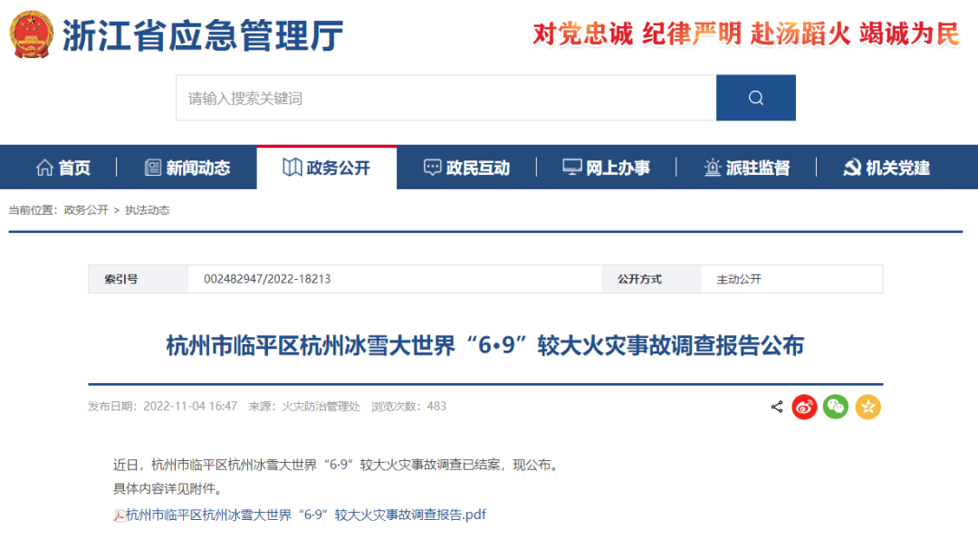 近日,造成4人死亡,2名消防员牺牲,19人受伤的“杭州市临平区杭州冰雪大世界“6·9”较大火灾事故调查报告”公布,事故直接原因为工人违章电焊切割作业时,熔渣引燃管道保温材料残片和装饰装修材料所致。