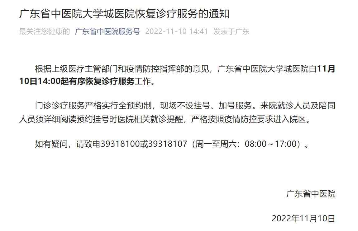 11月10日下午,广东省中医院发布通知,根据上级医疗主管部门和疫情防控指挥部的意见,广东省中医院大学城医院自11月10日14时起有序恢复诊疗服务工作。