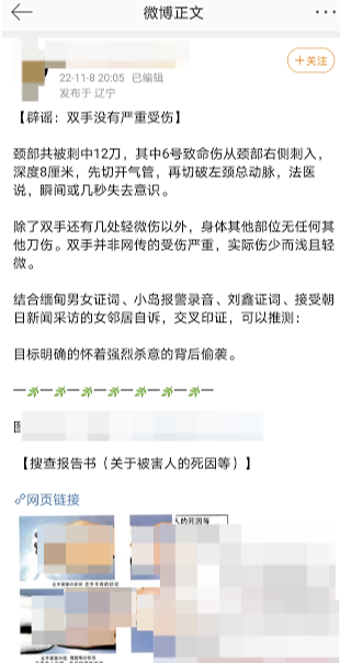 记者通过微博查询到,发布江歌遗体手部照片的网友,近年来长期发布一些江歌案件的相关信息,11月8日发布的江歌遗体手部照片疑来自一份《搜查报告书》。记者还发现,网上流传大量疑似江歌案的卷宗信息,其中包括陈世峰的陈述书、警方询问刘暖曦的笔录、江歌与刘暖曦的微信对话内容等。