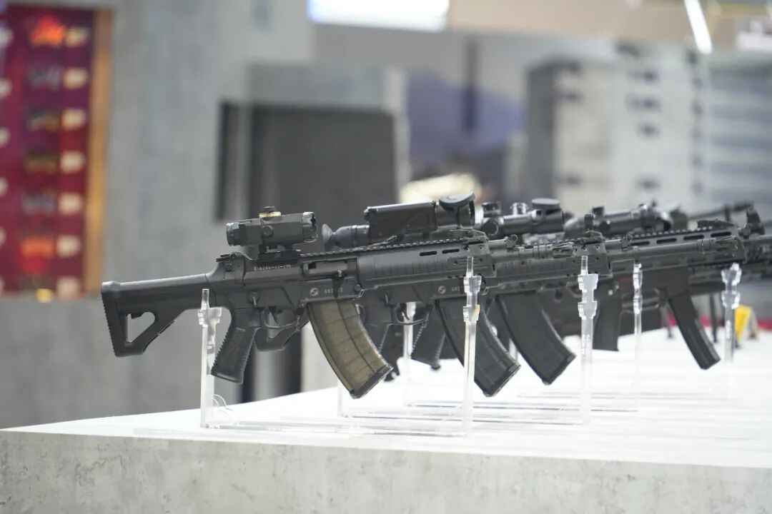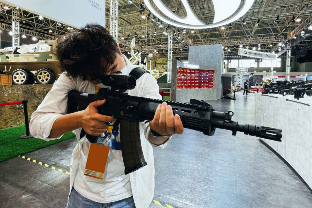 参观军迷体验“20式新枪族”中的QBZ192型短自动步枪。