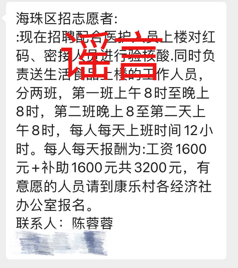 最近这几天,很多广州人大概都看到过这样一个聊天记录或截图:“现在招聘配合医护人员上楼对红码、密接人员进行验核酸,同时负责送生活食品上楼的工作人员。”这则“招聘信息”很具体,不仅有工作内容、时间、薪酬,还留有海珠区康乐村工作人员的电话,以供有意向的人员报名。