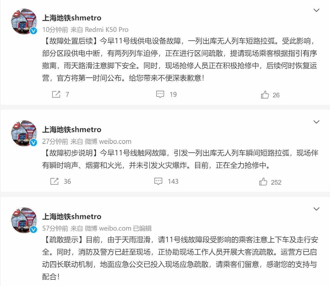 据最新消息称,今早11号线供电设备故障,一列出库无人列车短路拉弧。受此影响,部分区段供电中断,有两列列车迫停,正在进行区间疏散,提请现场乘客根据指引有序撤离,雨天路滑注意脚下安全。同时,现场抢修人员正在积极抢修中,后续何时恢复运营,官方将第一时间公布。