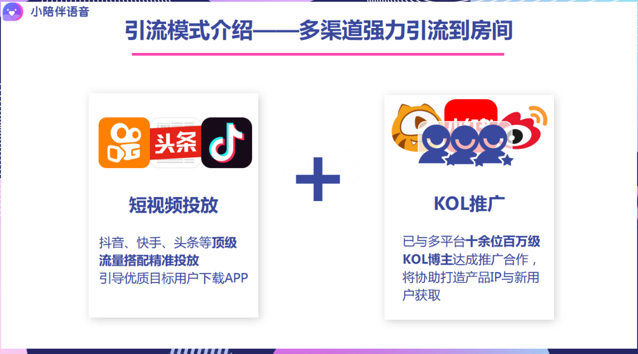 小陪伴运营已经在使用标准服务模式:为入驻平台公会的生产者制定了一套完整的扶持政策和运营策略,从流量和收益上全心全意为生产者服务,助力个人提升自我并实现自我价值,目前平台已与行内多个知名公会达成合作。