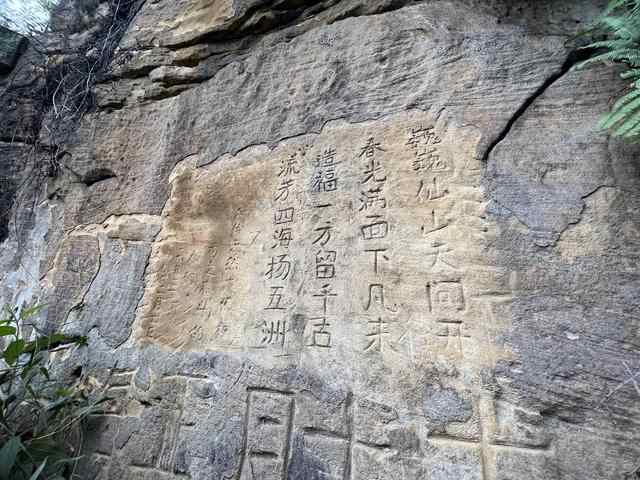 记者在佛头所在的崖壁上看到,雕塑四周只有两处文字记录,但因风化破坏严重,难以阅读。其中一处,可以清晰地辨认出“杨”“张”等简体字字样,疑似人名。另一处则刻有“巍巍仙山天问开,春光满面下凡来,造福一方留千古,流芳四海扬五洲”等句子,落款日期疑似为1992年,且全为简体字。