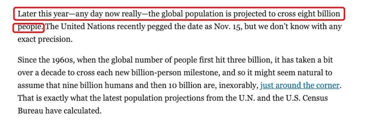 另外,今年8月,《华尔街日报》也在一篇报道中指出,对于全球人口将达到80亿的确切日期,我们仍不清楚;但实际上,在今年晚些时候,甚至是近来的任何一天,全球人口都有可能达到这一数字。