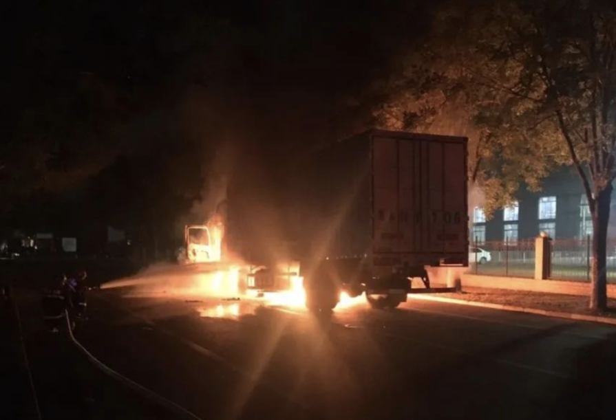 2020年11月,北京大兴区瀛顺路一货车起火。到场后,消防员看到现场车头位置的火势已经处于猛烈燃烧阶段,这时“嘣”的一声,货车轮胎在大火中受热发生爆炸,火势迅速向车厢处蔓延。