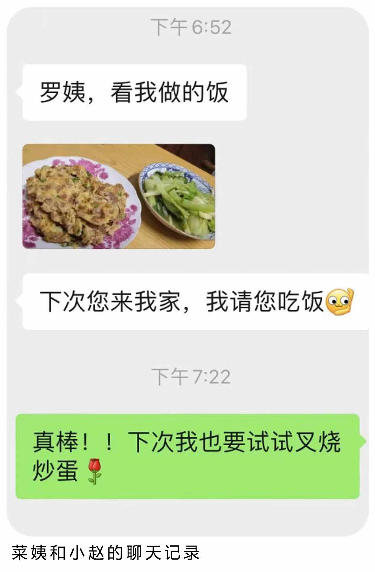 小赵在闲暇时光会陪着菜姨上天台浇水施肥,向她学习如何种菜。最近,小赵发来了一条信息,上面记录了她居家的“学习成绩”——叉烧炒鸡蛋和白灼生菜。