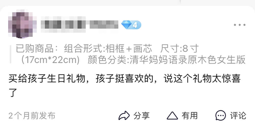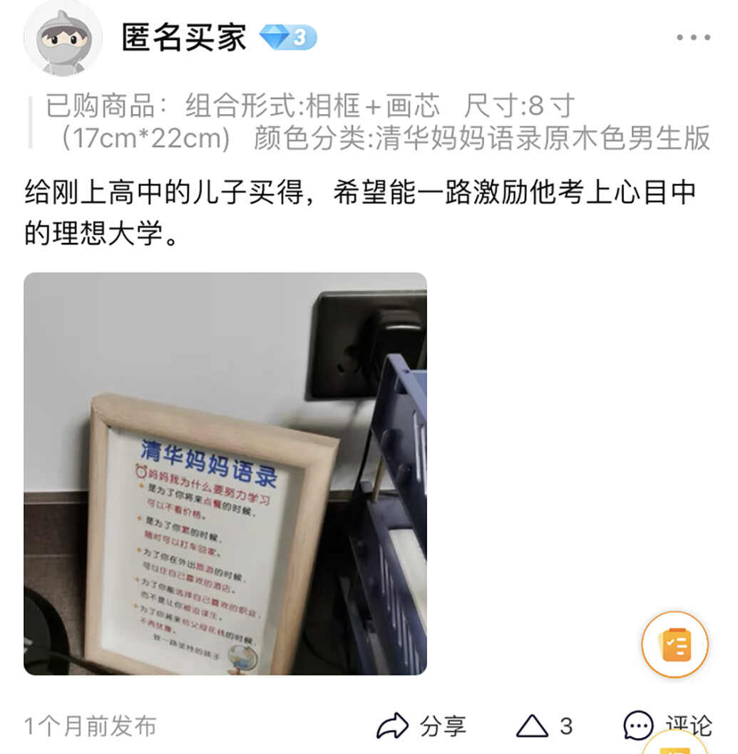 近日,电商平台销售的“清华妈妈语录”引发关注。该商品有木质相框摆件、也有墙纸形式,内容均为激励孩子努力学习的话语。这类商品在部分网店销量不菲,有买家评价称,“买给孩子的生日礼物,太惊喜了”“送给读高中的儿子,很有激励作用”等。