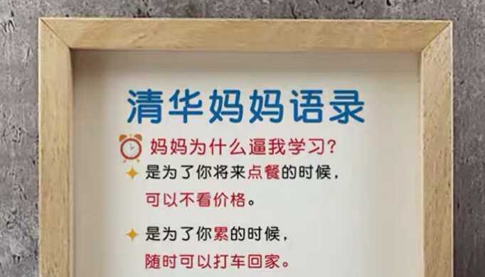 身为90后的果果(化名)最近和丈夫有了备孕计划。对于这类励志语录,她的丈夫认为,这就是把学习功利化,虽然功利一点也没太大关系,但把努力学习简单等同于以后可以赚好多钱,这一点在现实生活中不能完全成立,如果孩子真信了,以后可能会崩溃。