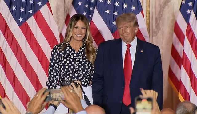 一曲《Do you hear the people sing》播放完毕,特朗普及夫人梅拉尼娅出现在海湖庄园的“金色舞厅”。三个月前,联邦调查局探员刚刚以特朗普私藏秘密文件的名义突袭搜查过这里。现在,450名特朗普支持者聚集于此,戴着红色的写着“让美国再次伟大”帽子,为“下一届美国总统特朗普先生”欢呼。现场观众包括2020年特朗普竞选团队的诸多高层,但几乎没有华盛顿的重要人物到场。
