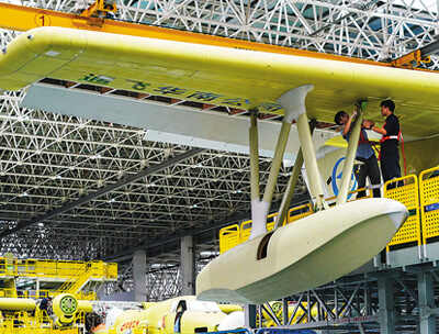工程师在珠海中航通飞华南飞机工业有限公司AG600M总装线上进行总装作业。