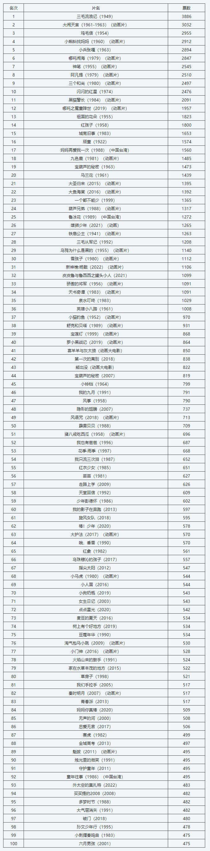 该机构发布的中国儿童电影百年百部经典名单显示,《三毛流浪记》(1949)、《大闹天宫》(1961-1963,动画片)、《鸡毛信》(1954)、《小蝌蚪找妈妈》(1960、动画片)、《小兵张嘎》(1963)位列榜单前五。近年的儿童电影中,《哪吒之魔童降世》、《大圣归来》、《大鱼海棠》等多部动画片也出现在名单中。