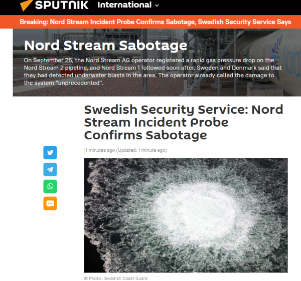 9月26日,俄罗斯向欧洲输送天然气的海底管道“北溪-1”和“北溪-2”发现4处泄漏点,分别位于丹麦和瑞典专属经济区。丹麦和瑞典地震监测机构观测到泄漏点所在区域当天发生强烈震动,认为发生“爆炸”。两国政府和欧洲联盟怀疑泄漏为“蓄意破坏”所致。