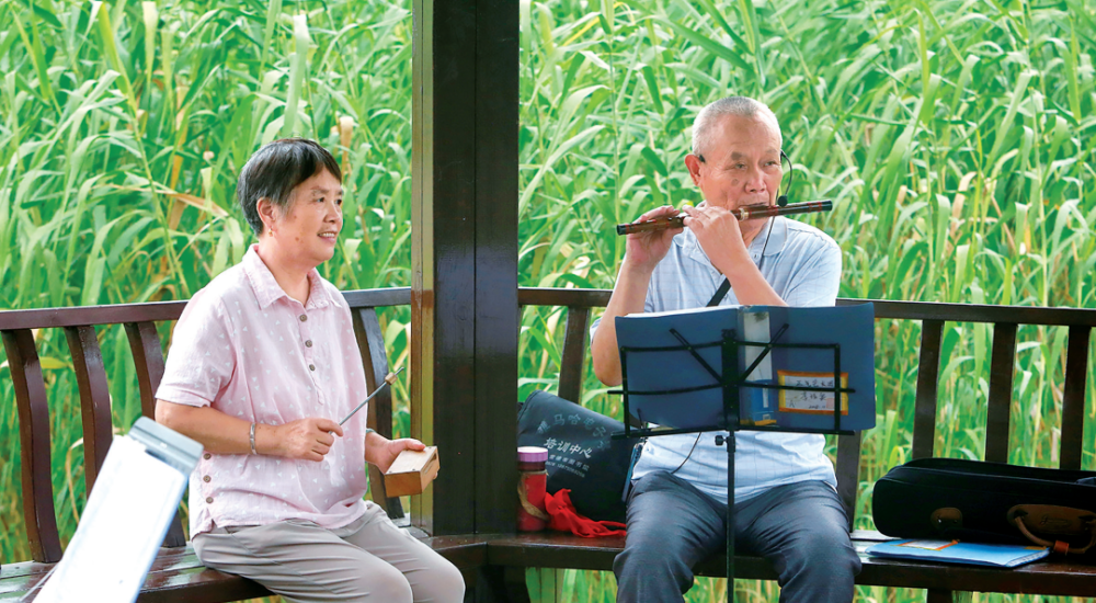 市民在湖南常德市穿紫河河畔的凉亭里吹奏乐器(2021年9月6日摄) 李龙摄 / 本刊