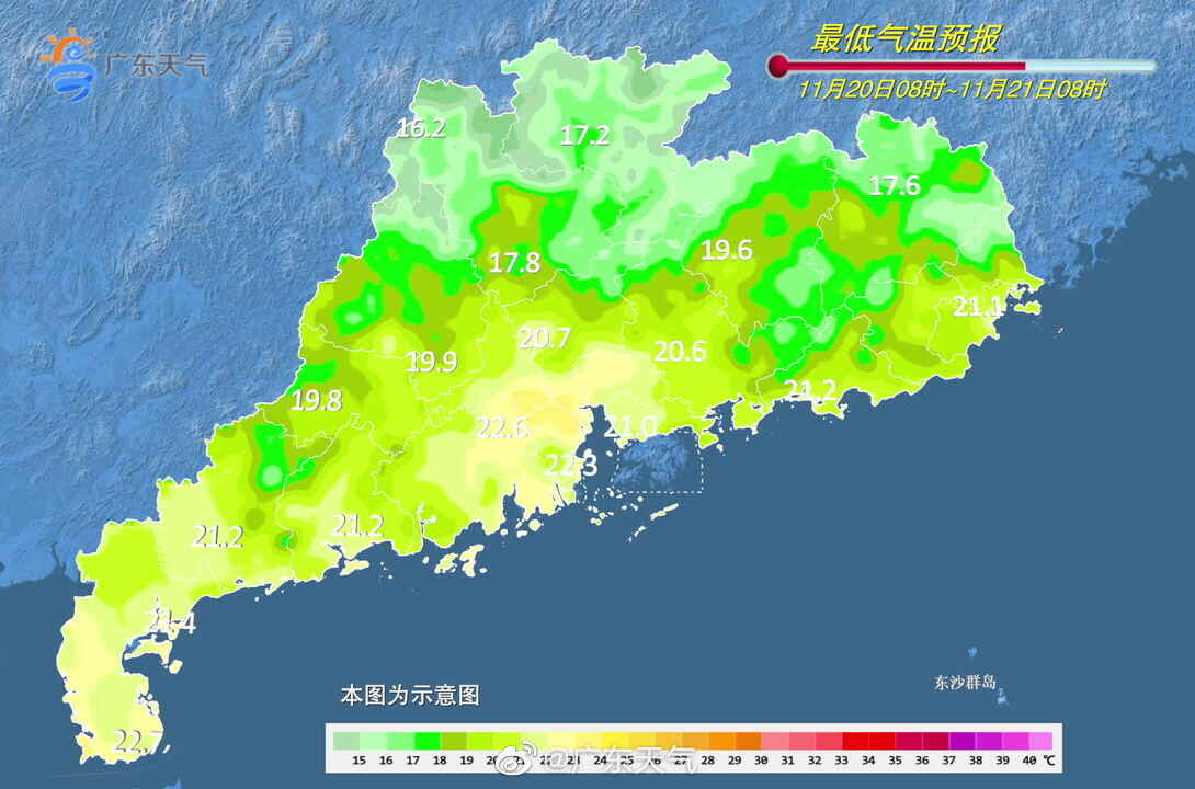 20日,粤北市县有分散小雨,广东最低气温普遍在15℃以上