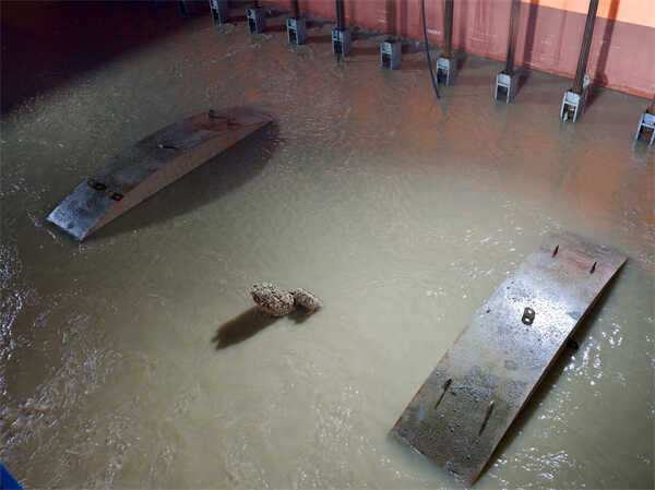 为了平稳安全提升弧形梁形成的沉箱并顺利将其护送至船坞,工作团队创造性地设计并建造出一艘专用打捞工程船“奋力轮”。“奋力轮”主尺度长130米,宽34米,型深9米,设计吃水6米,两端设有同步提升装置,在船中部开口,自带一个长56米、宽20米的月池。穿梁完成后的弧形梁沉箱装载着古船直接由“奋力轮”从海底提升至中部月池,并转运、卸载至船坞,一艘船完成了提升、运输、卸载三项任务,具有安全性高、操作性强、科技含量高等诸多优点。