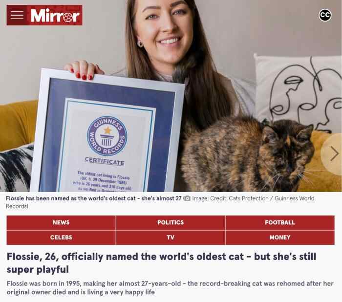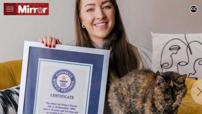据英国《镜报》24日报道,居住在英国伦敦的猫咪弗洛西(Flossie)已经有26岁零300多天大,它本月被吉尼斯世界纪录认证为世界上现存最长寿的猫。