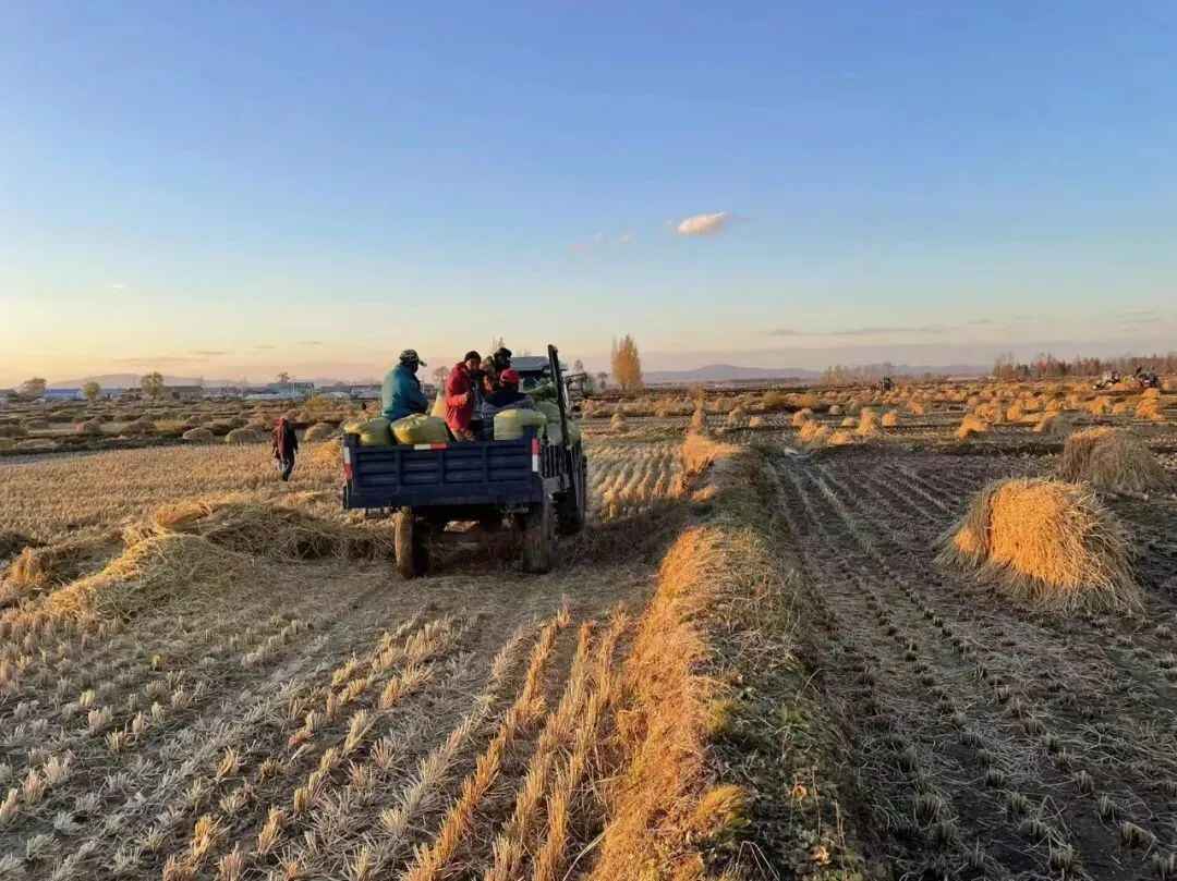 在张雪老家,五常市卫国乡长安村,水稻种植户在收获粮食。