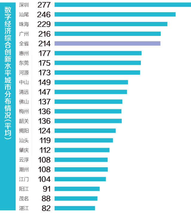 从数字经济综合创新水平城市排名情况来看,“一核”珠三角9市位于全省前列,其中深圳、广州、东莞、佛山、珠海位于前五位;