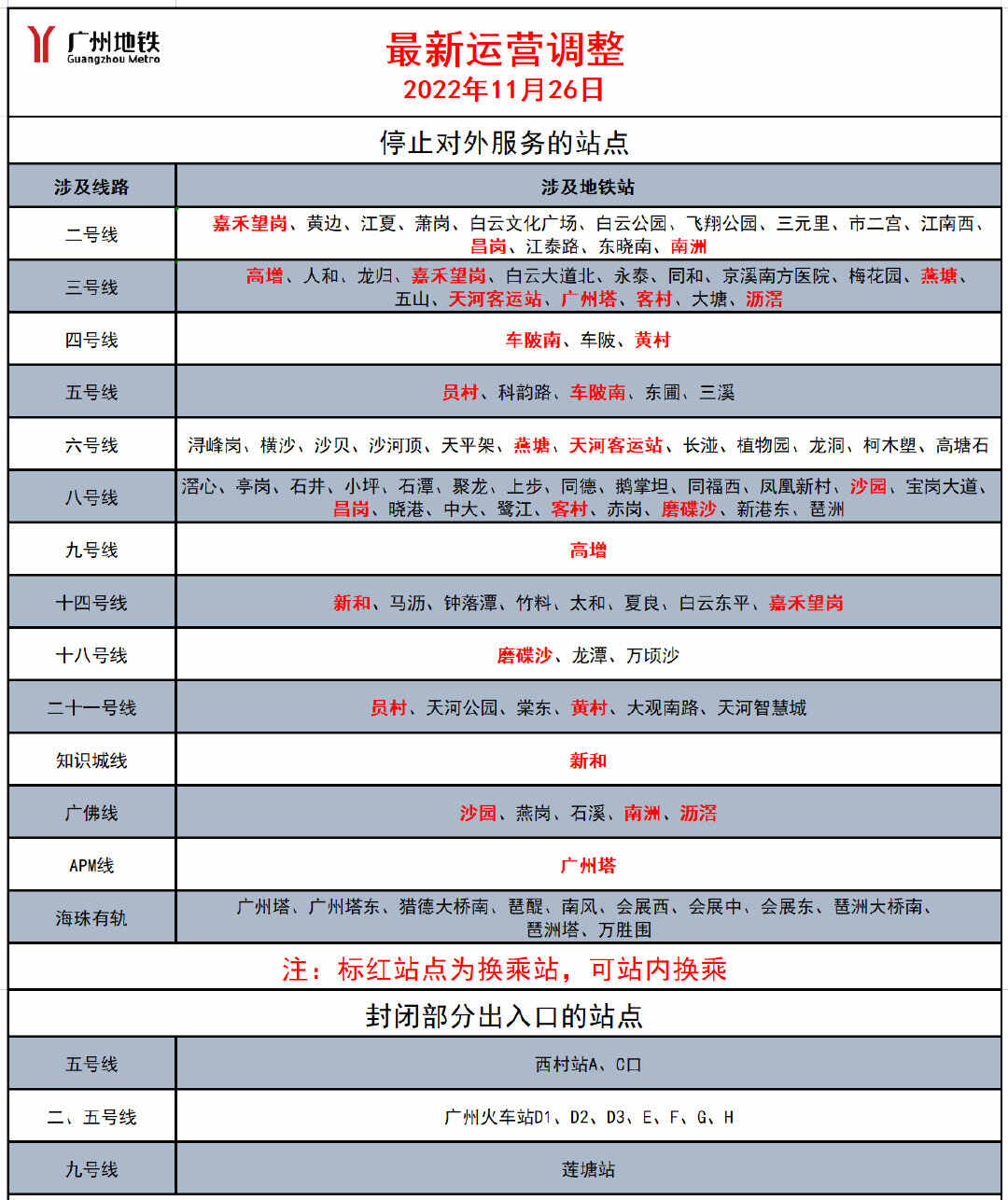 此外,2022年11月26日10:00起,海珠区内部分地铁站停止对外服务:二号线市二宫站、江南西站,八号线同福西站、凤凰新村站、沙园站,广佛线沙园站停止对外服务,其中沙园站保留站内换乘功能。