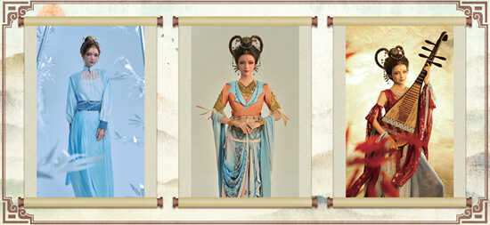 郑屹呈介绍,天妤的发型设计是“双环望仙髻”,簪花是用金、银、铜等金属材料制成多种样式的金钿;头上戴的嵌松石花钗、珍珠流苏花钿等饰品,是在史料基础上,参考唐代出土文物设计而成;妆容上使用的黛眉、斜红、莲花形花钿、桃花妆容,则是还原了新疆吐鲁番阿斯塔那墓出土的唐代女俑妆容……